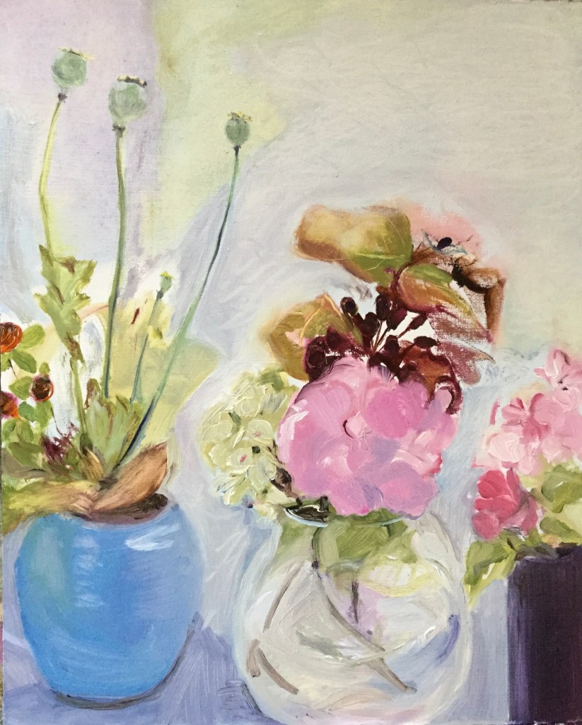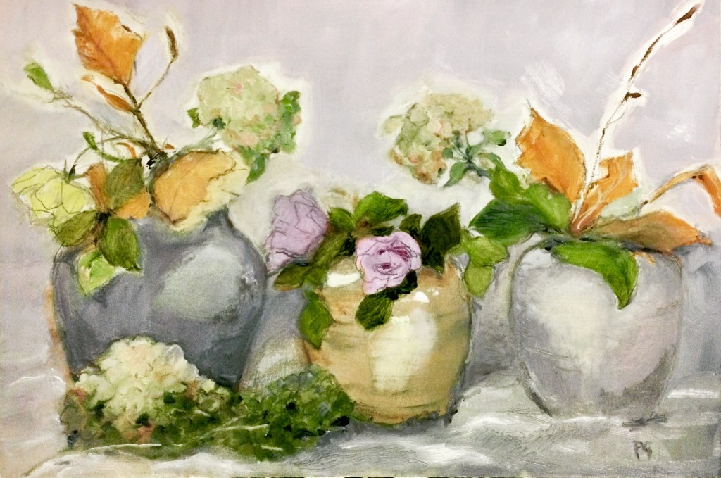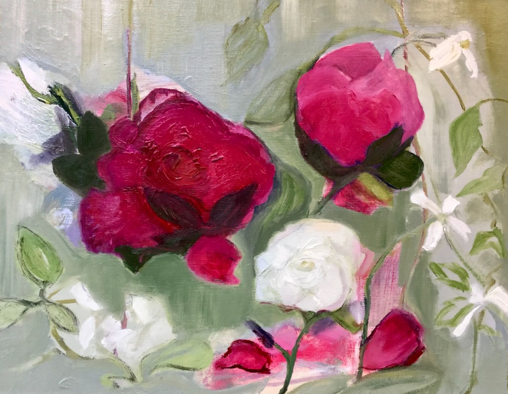 ‘Two pink roses’ Oil on board 60x40cm SOLD‘Autumn remnants’ Oil on board 60x40cm. Framed £350‘Floral dance’ Oil on board 50x40cm NFS‘Floribunda’ Oil on board 50x40cm NFS‘Late summer’ Oil on board 40x50cm SOLD‘Peonies with lawn’ Oil on board 50x40cm NFS‘Two peonies and one white rose’ Oil on board 50x40cm