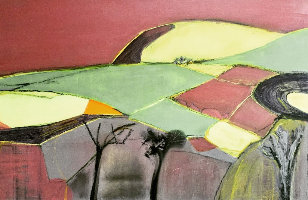 Large, acrylic painting developed from my sketch on a walk across fields, looking towards the high cliffs of the Dorset coast. An exciting composition. Looks great in its new home.
