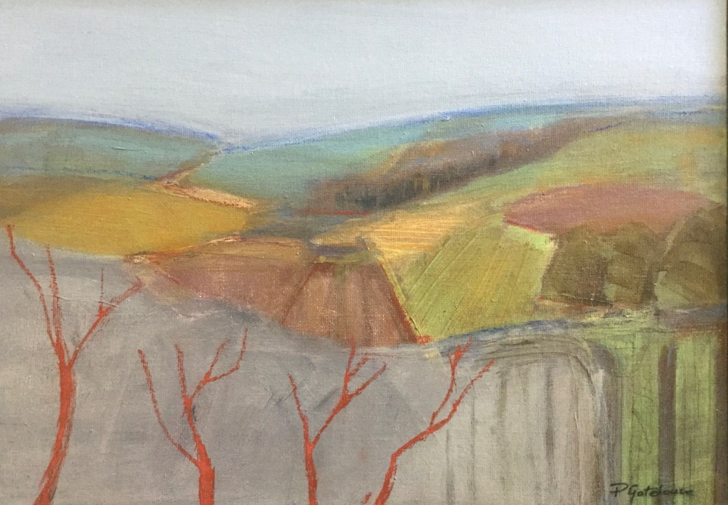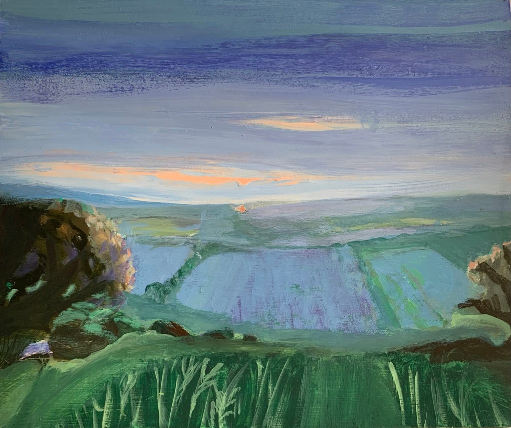 Gouache on board, my memory of a view in north Dorset with beautiful colours. I cannot bear to part with this one yet ! NFS