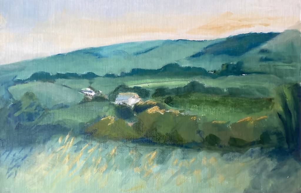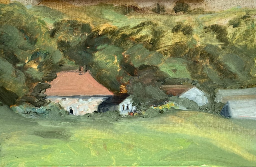 I was particularly interested in the rthyms of trees and foliage on the hillside, the cottage and outbuildings blending in with the natural world.