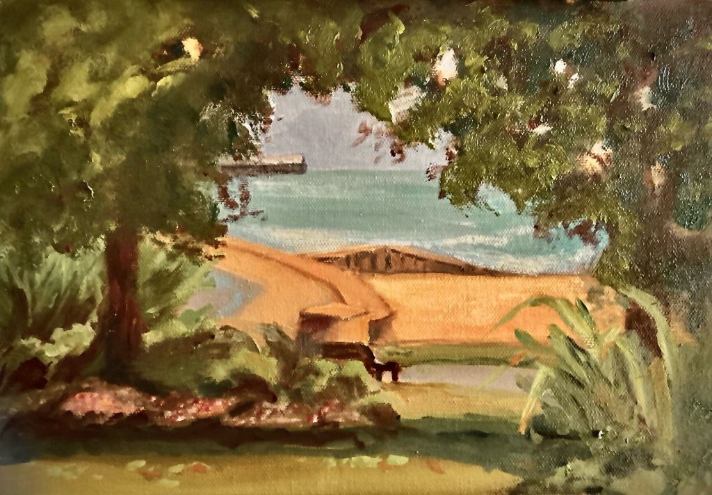 Very relaxing to stroll along the Esplanade and fabulous beach at Ryde IOW. Ideal to be able to paint this view from the shade of trees in Appley park on a hot summer’s day. Oil on board 30×20 cm.